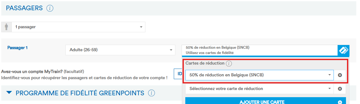 Lorsque vous utilisez un Coupon FIP SNCB, un billet transfrontalier peut être réservé via le site web, qui prend en compte le trajet gratuit sur le territoire belge. Pour cela, sélectionnez la réduction “100% Discount Belgium (SNCB)” pour les voyageurs. Cela permet par exemple de réserver très facilement des trajets de la Belgique vers Lille (hors TGV, tarif global et non exploité par la SNCB).